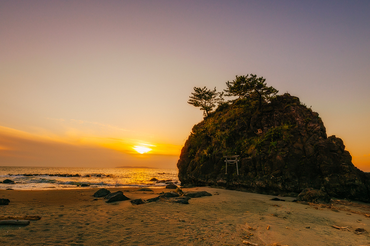 碁石集落のシンボルである金毘羅岩は海上の守護神として安全祈願されており、岩の頂上にそびえる緑鮮やかな松が日本海の波しぶきに耐えて立つ姿は見事です。