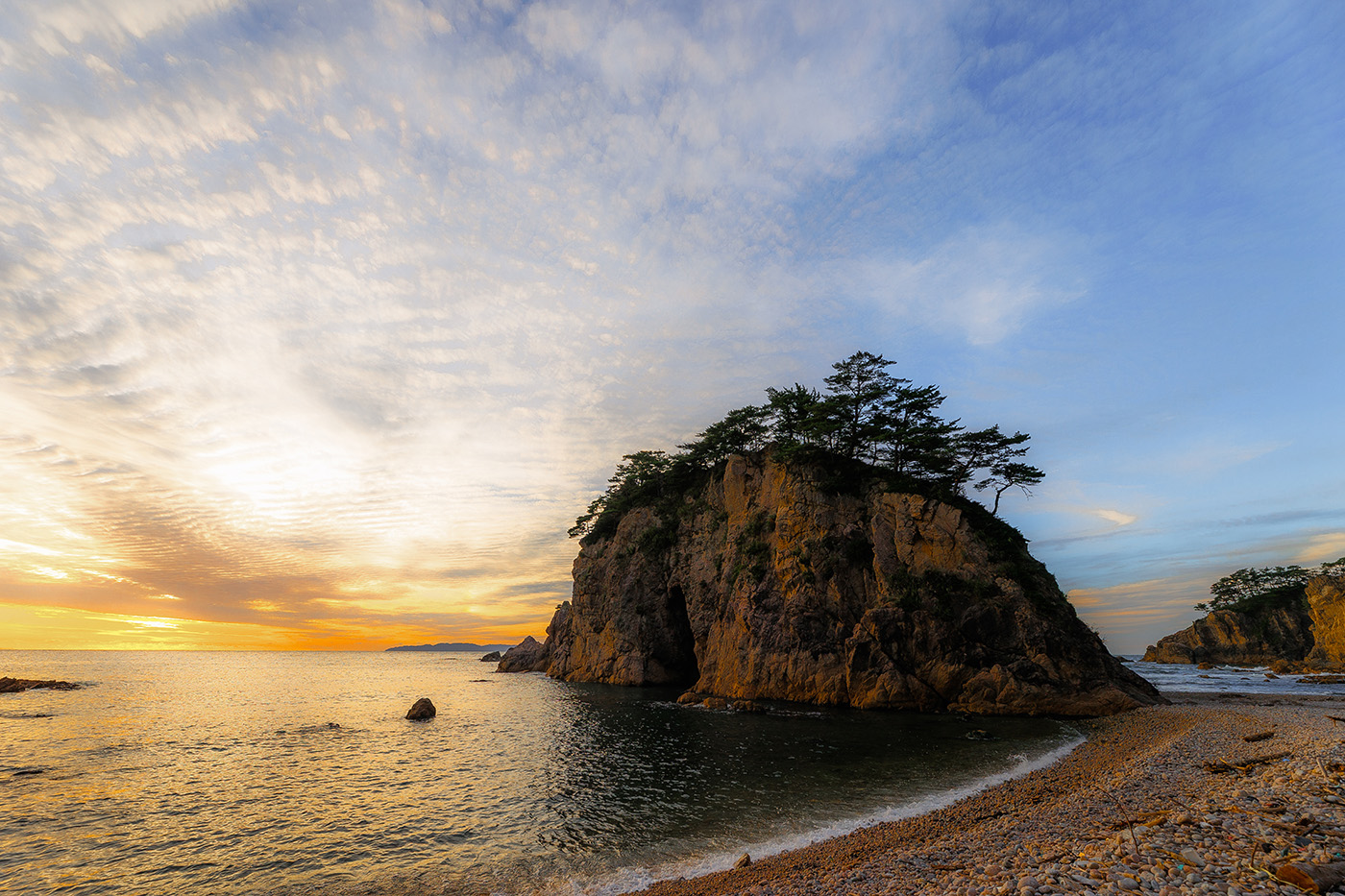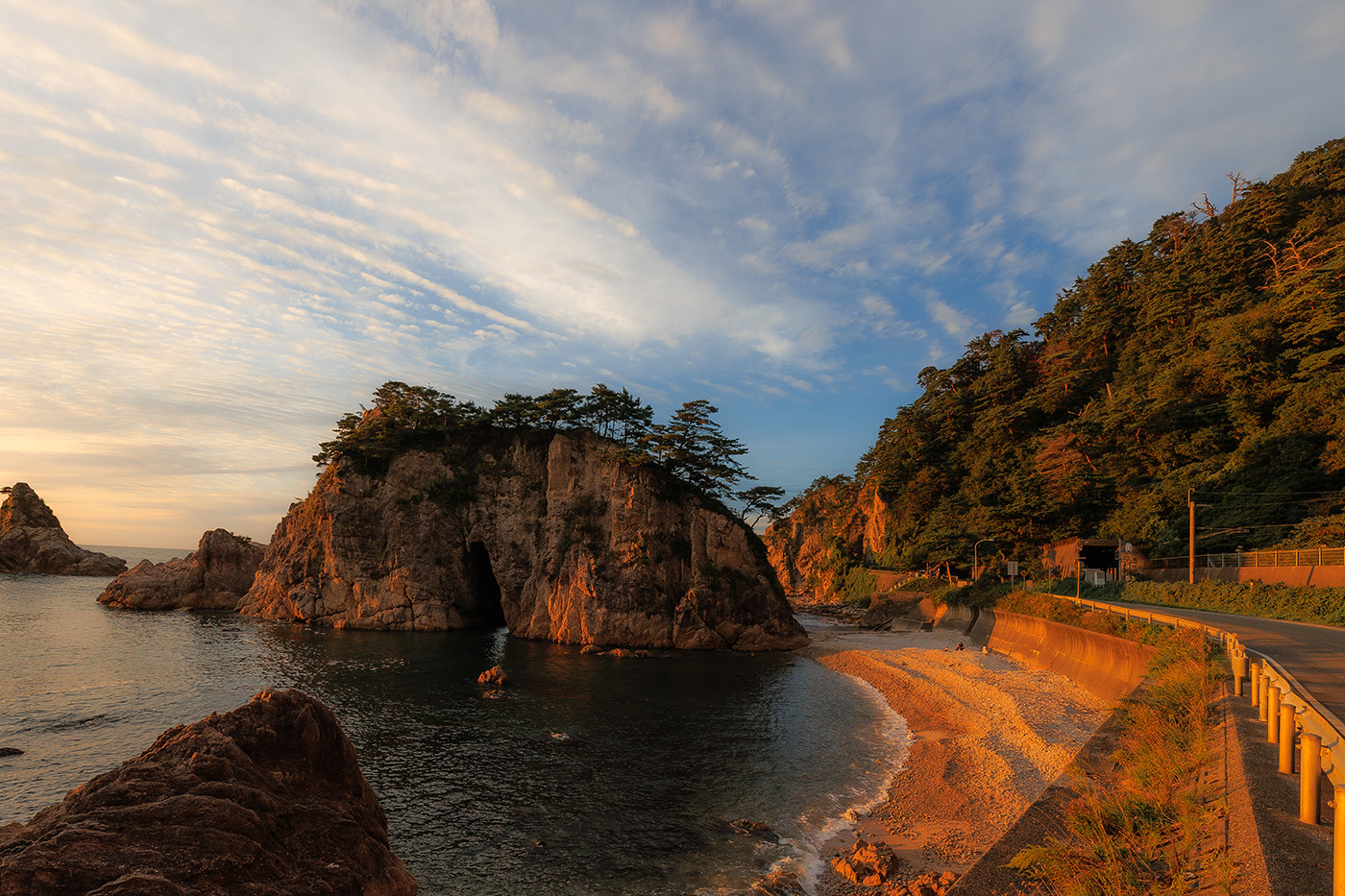 夕暮れ時には澄んだ海と奇岩、青松が美しいコントラストを織りなし、訪れる人の心を魅了します。