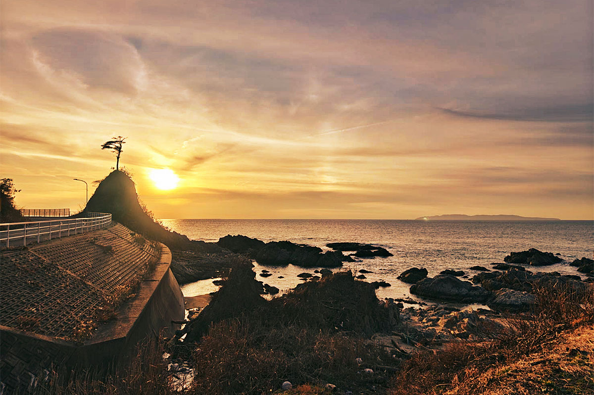 新潟県で一番北にある海水浴場で、国指定名勝天然記念物の筥堅八幡宮社叢を南側に見ることができます。地名の由来といわれる海岸の小石は、まさに囲碁の石を思わせる白黒のコントラストです。